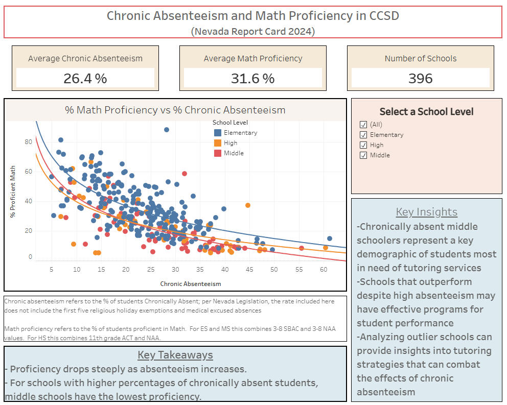 Middle school students with high absenteeism show the lowest math proficiency, making them the most in need of tutoring. By focusing marketing efforts on this group, the center can attract more students, boost enrollment, and increase revenue.The dashboard is dynamic and adjusts based on what school level is selected. The full project can be viewed on my Tableau public profile here