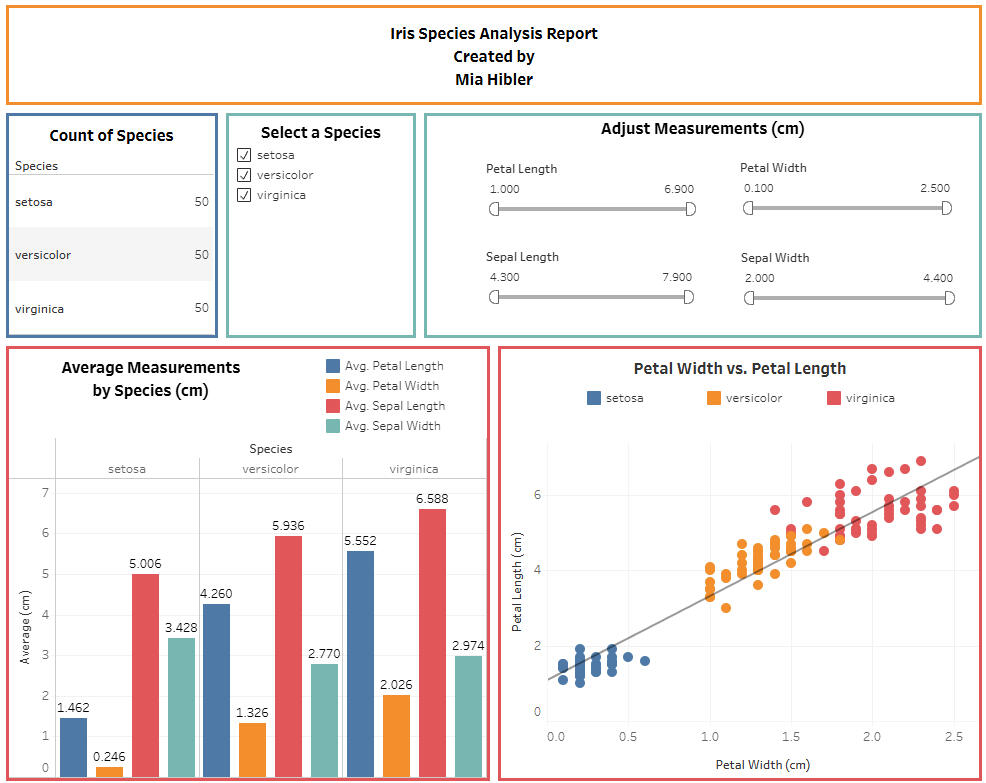 This project uses SQL for data validation and summary statistics, Python plotting libraries for visualization and modeling, and Tableau for interactive dashboards. This analysis reveals patterns across 3 species of Iris and the data can be found on Kaggle.Here are the questions I was interested in answering:
