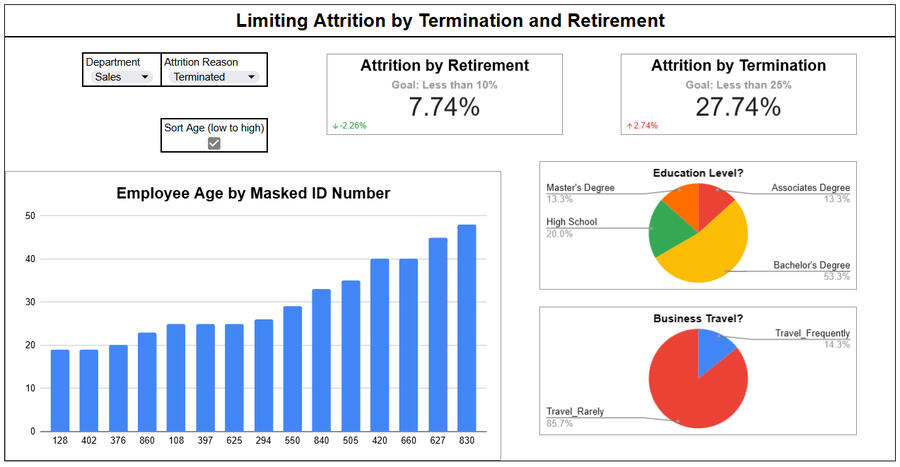 2) The company did not meet their goal of keeping the percentage of attrition due to termination under 25%.The dashboard is dynamic and updates charts based on department or attrition reason selected via the slicer. View the full dashboard here.