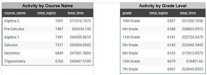 1) Algebra 2 (mid-level) and Pre-Calculus (higher-level) are the most popular math courses, showing similarly high total logins.