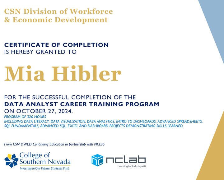Hello! I'm Mia Hibler and I began my career as an educational facilitator, where I developed strong communication and problem-solving skills.Now, I’m transitioning into data analytics, utilizing tools such as SQL, Excel, and Tableau to discover insights and tell stories with data.I’m passionate about making data approachable and useful for decision-making.